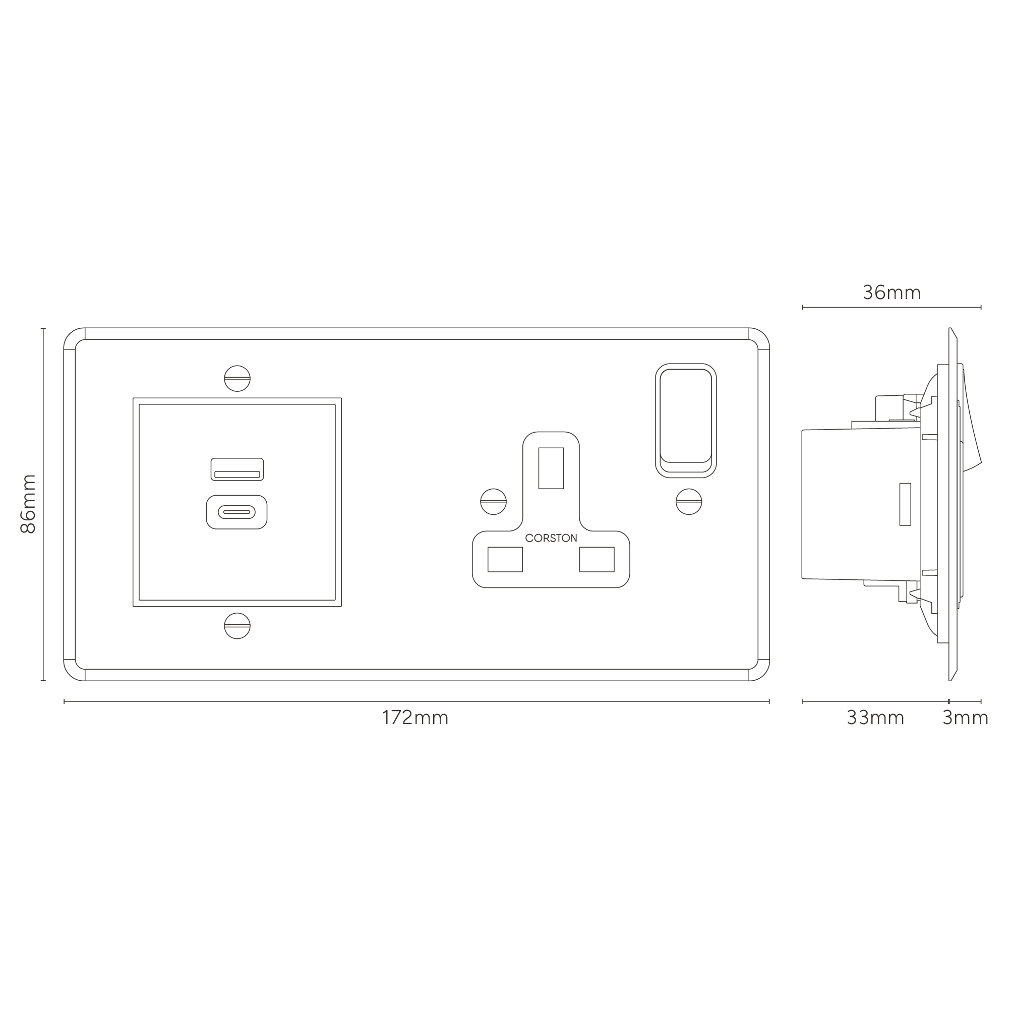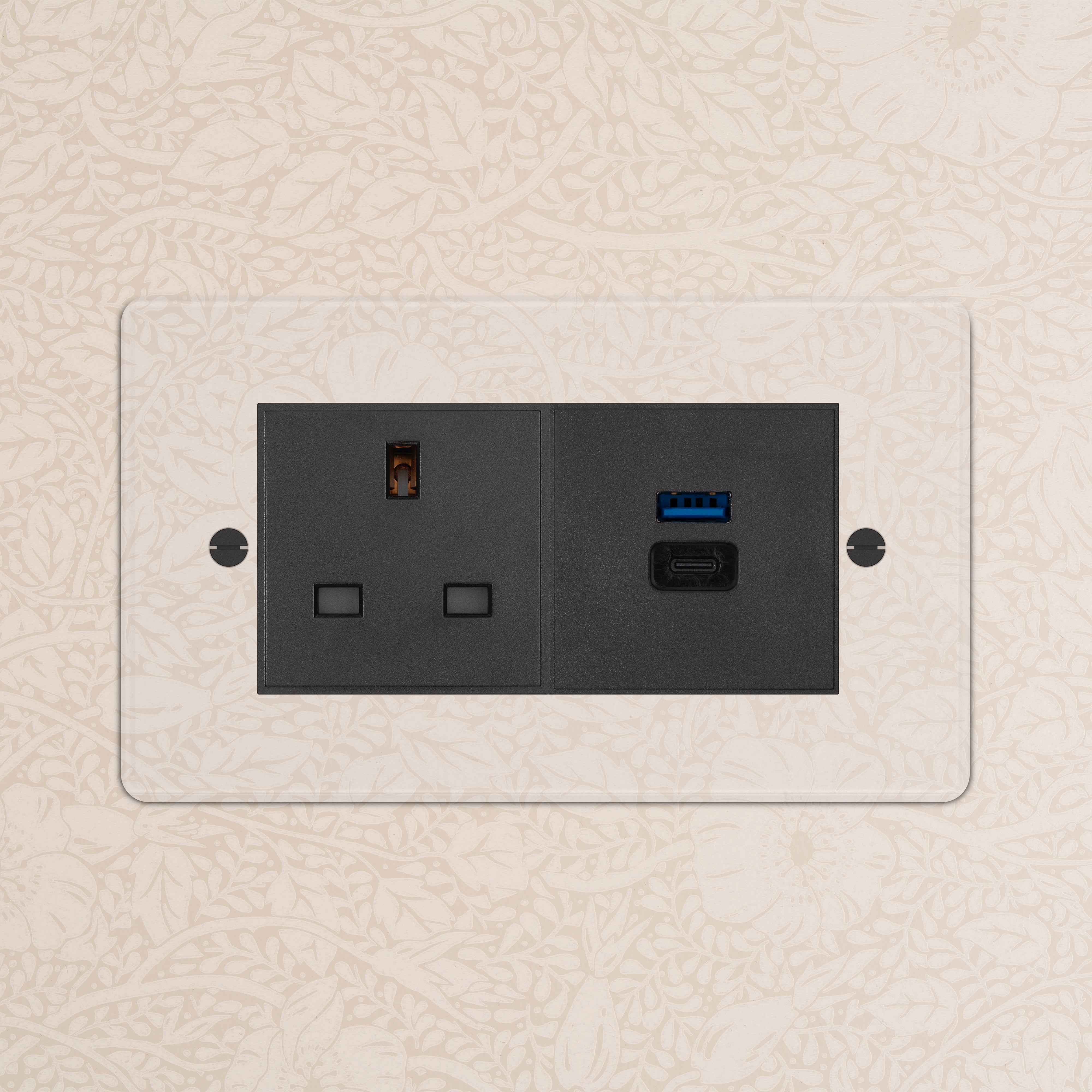 This double mixed socket combines an unswitched 13A socket and a dual USB-A+C fast charge socket on one plate.