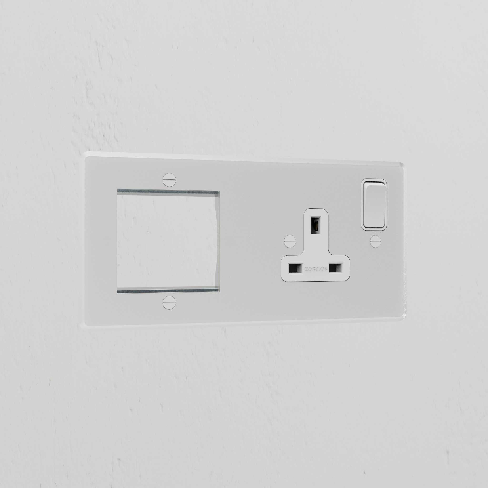 This clear 50mm module plate works with any one of our 50mm or two 25mm modules (just make sure you choose the ones made with white plastic). It comes with a built-in UK socket too.