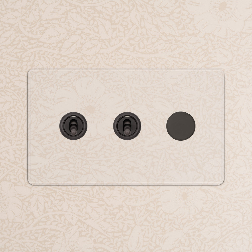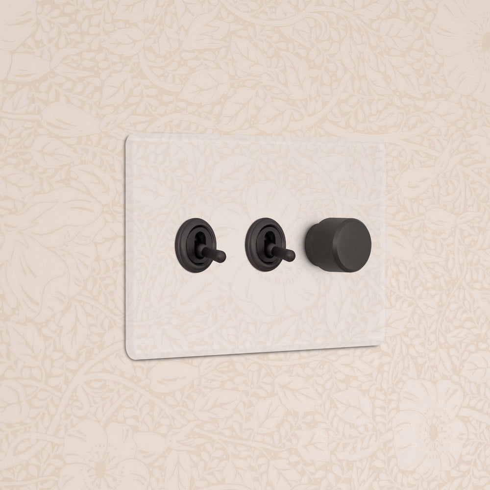 This 3 gang mixed switch combines two two-way toggles and a rotary dimmer on one plate.
