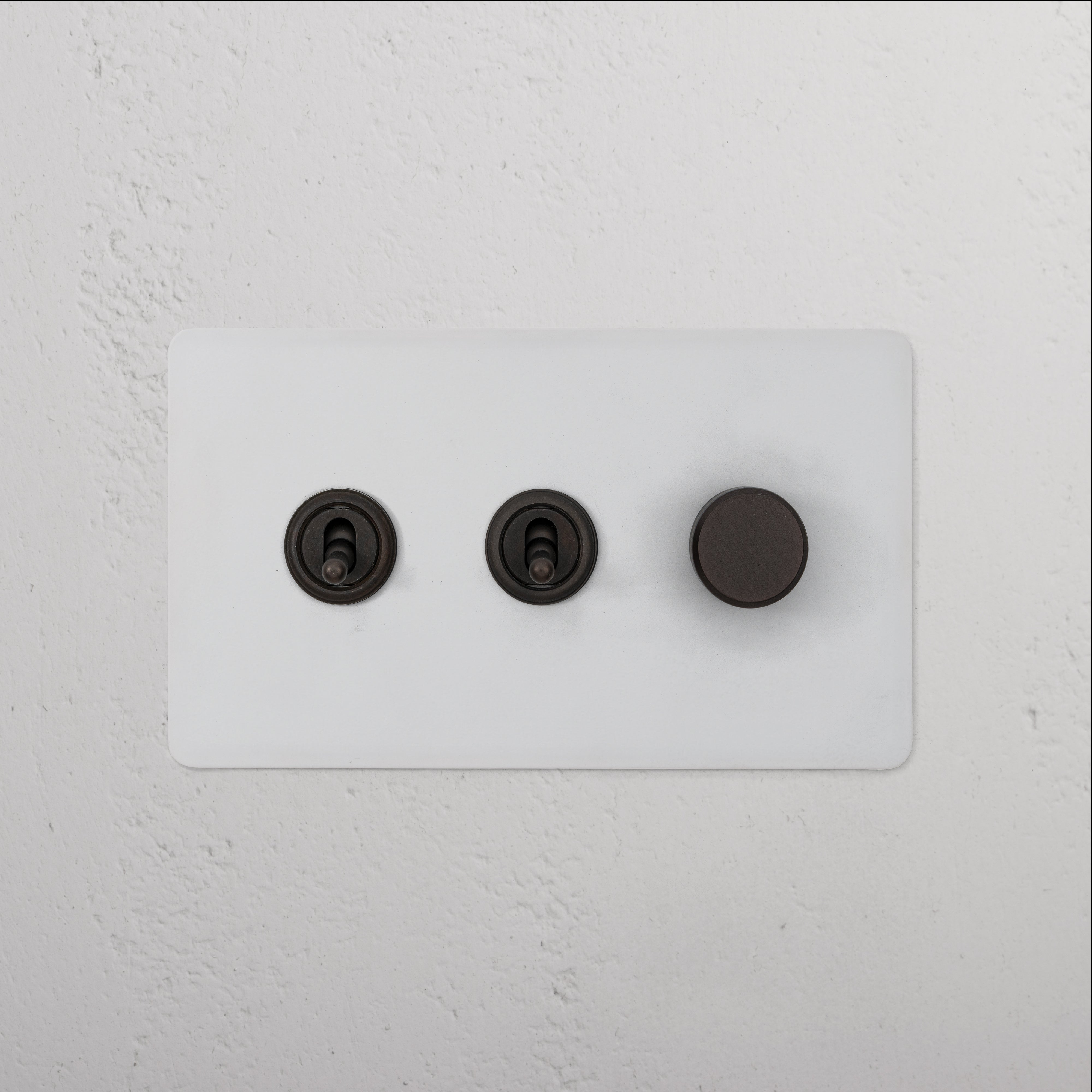 We prepare our paintable plates using our own etch primer, so you can easily paint them the same colour as your walls. The toggles and dimmer are finished in bronze.