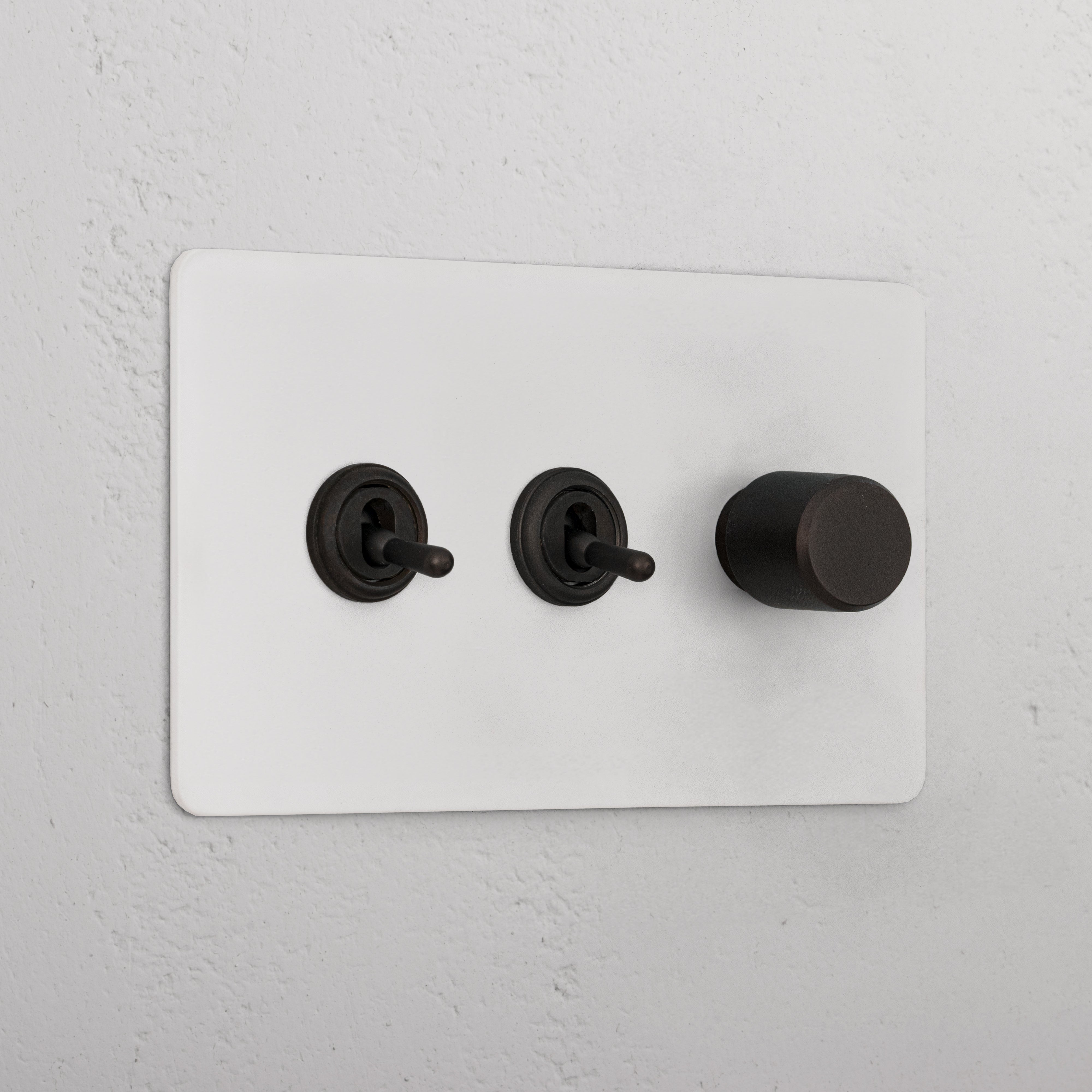 This 3 gang mixed switch combines two two-way toggles and a rotary dimmer on one plate.