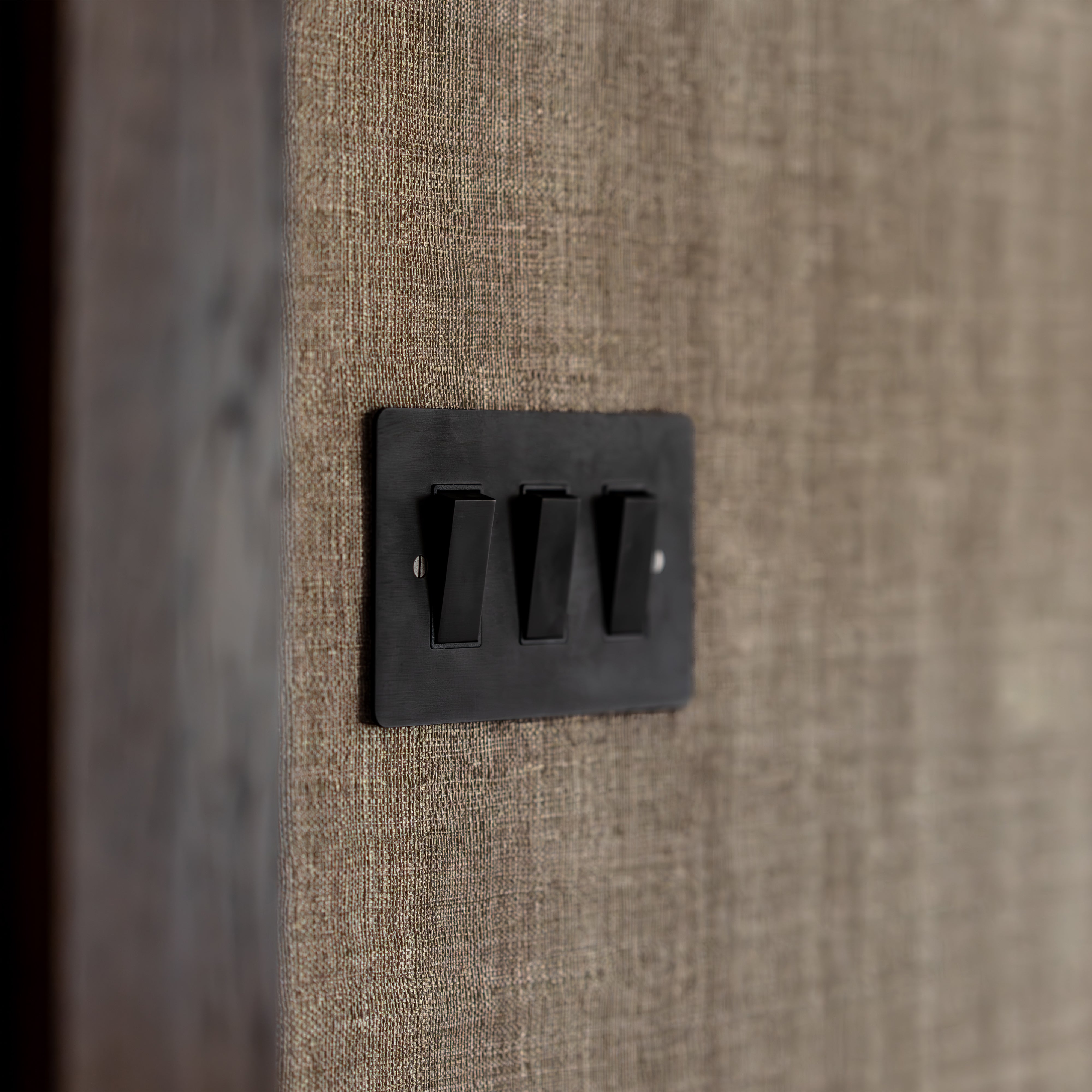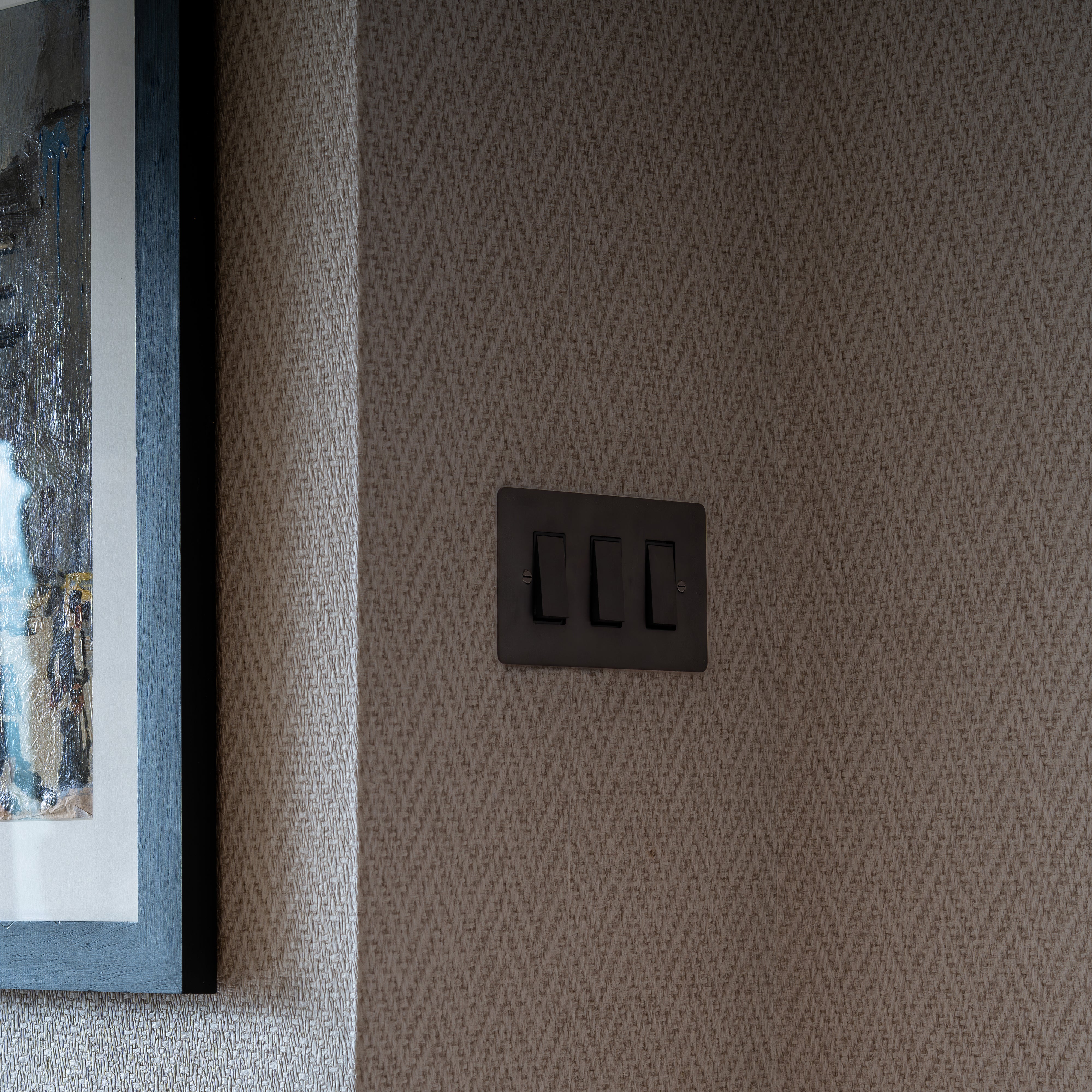 This three-gang, two-way rocker switch in our Bronze finish sits flush to the wall. The front plate is also just 1.5mm thick.