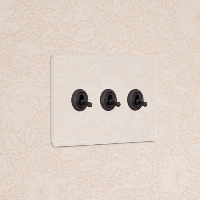 Our 3 gang two-way toggle switch is a modern take on the classic dolly design. We’ve crafted it to be as sleek and timeless as possible in any interior setting.