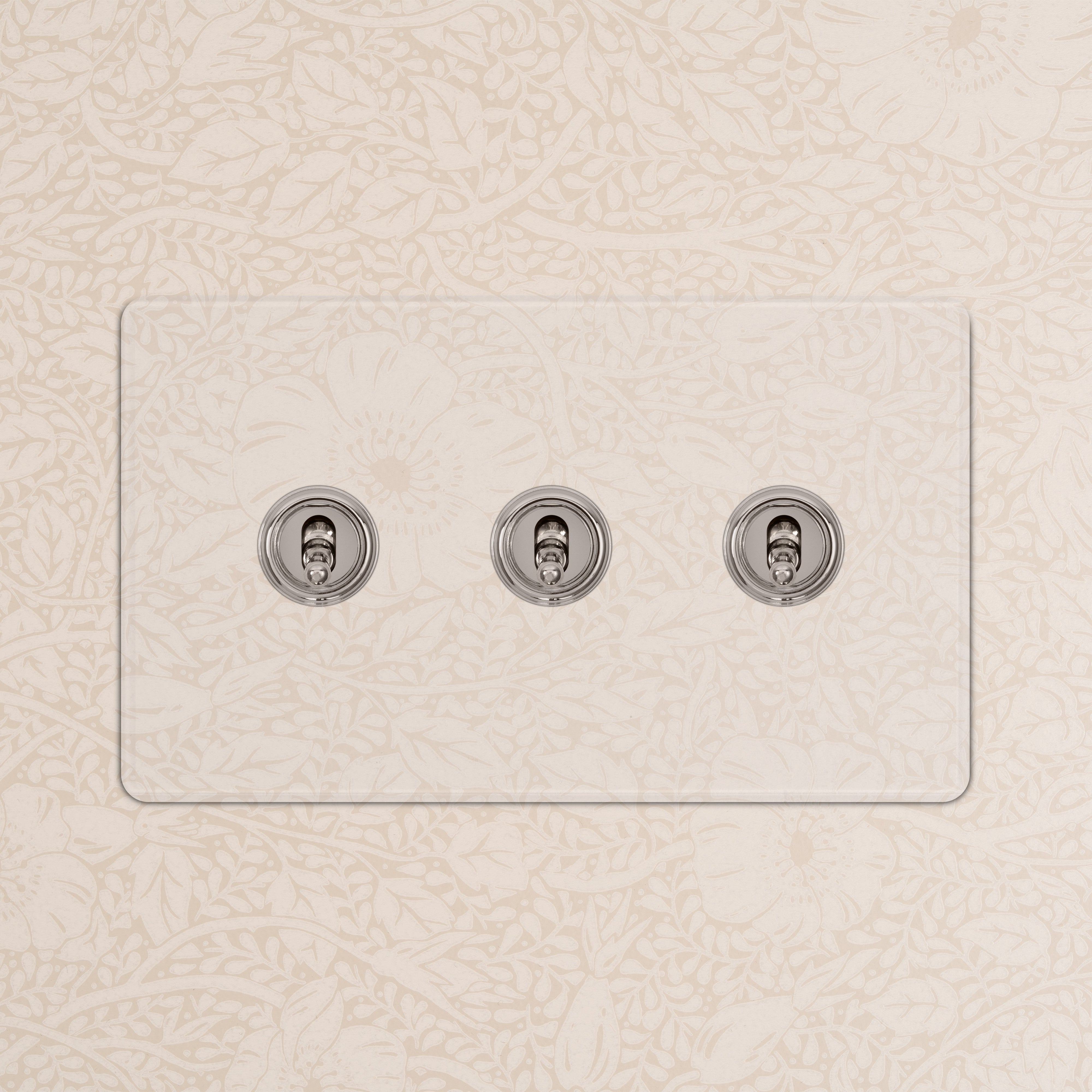 Our 3 gang two-way toggle switch is a modern take on the classic dolly design. We’ve crafted it to be as sleek and timeless as possible in any interior setting.