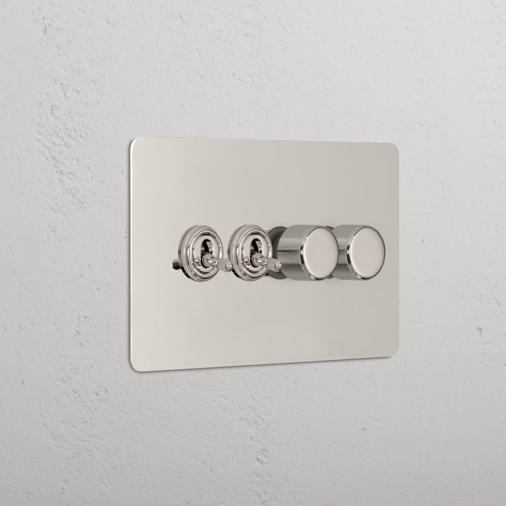 This 4 gang mixed switch combines two two-way toggles and two rotary dimmers on one plate.