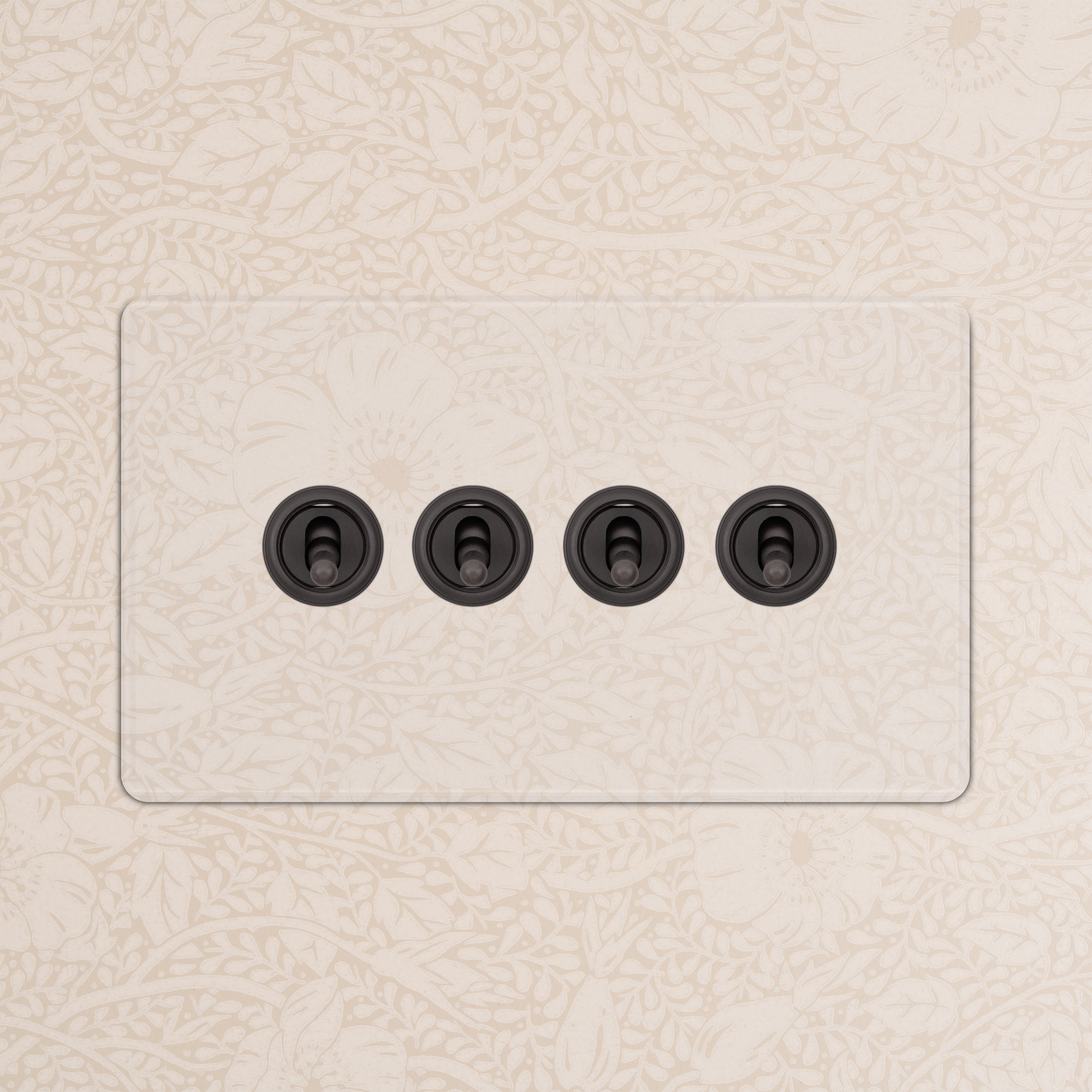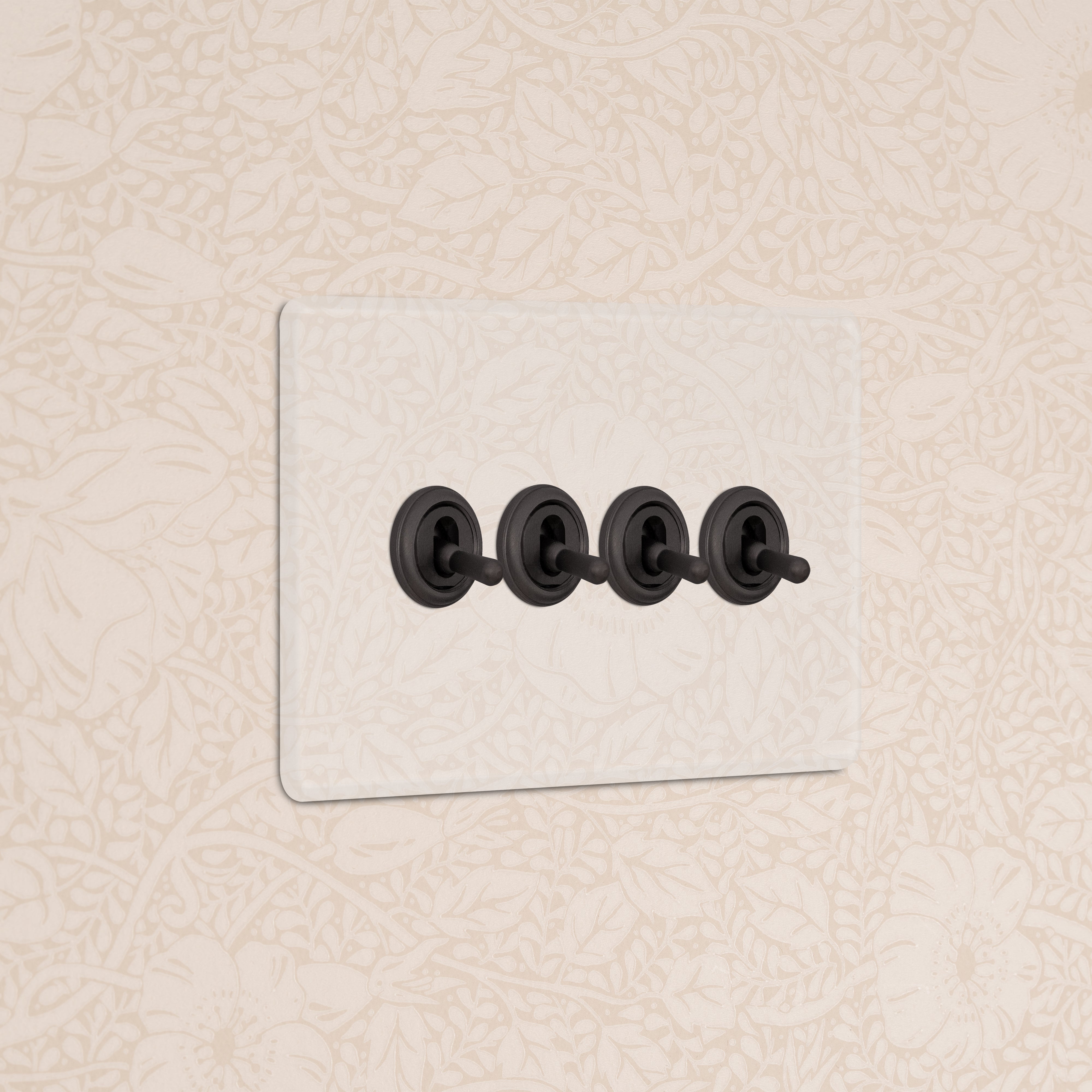Our 4 gang two-way toggle switch is a modern take on the classic dolly design. We’ve crafted it to be as sleek and timeless as possible in any interior setting.