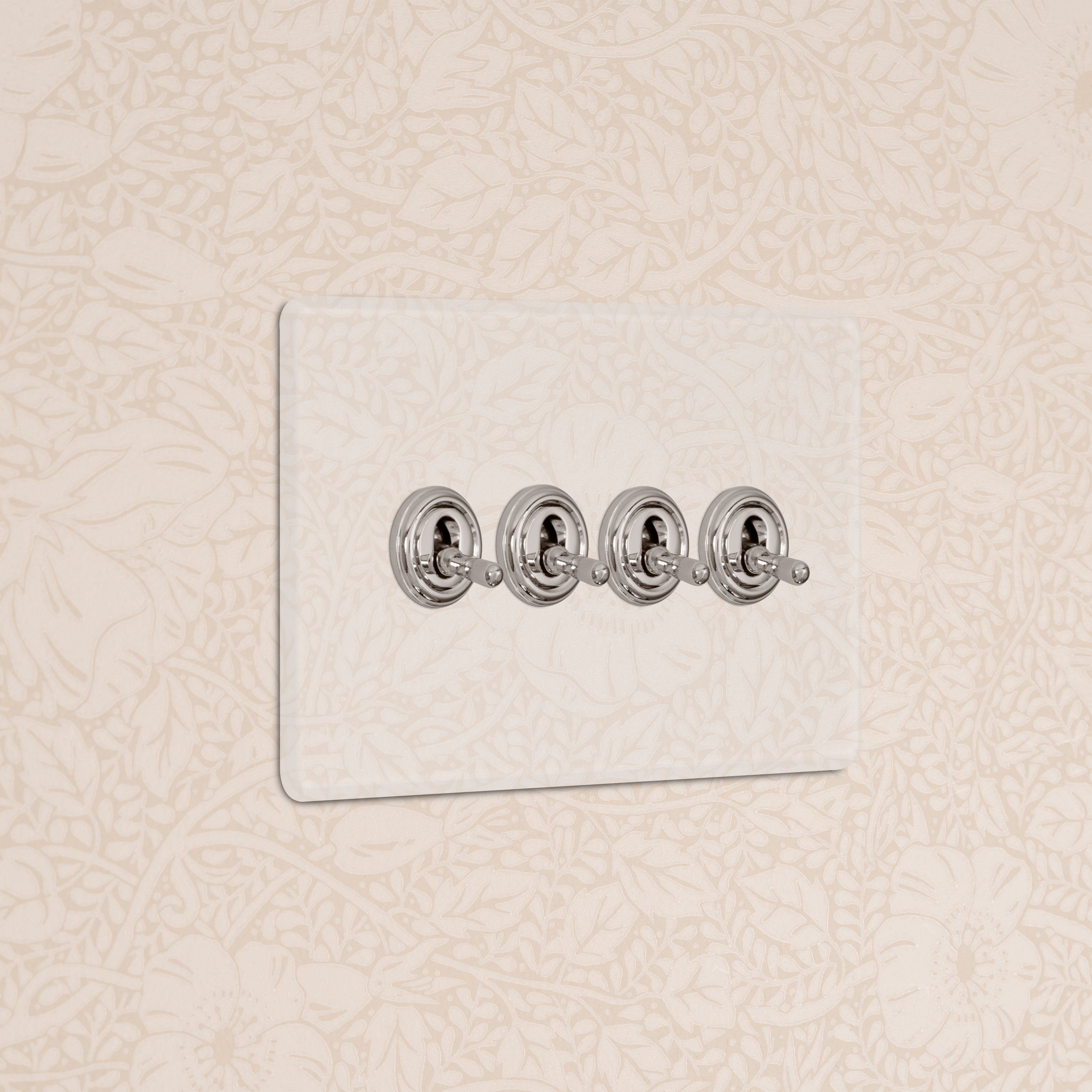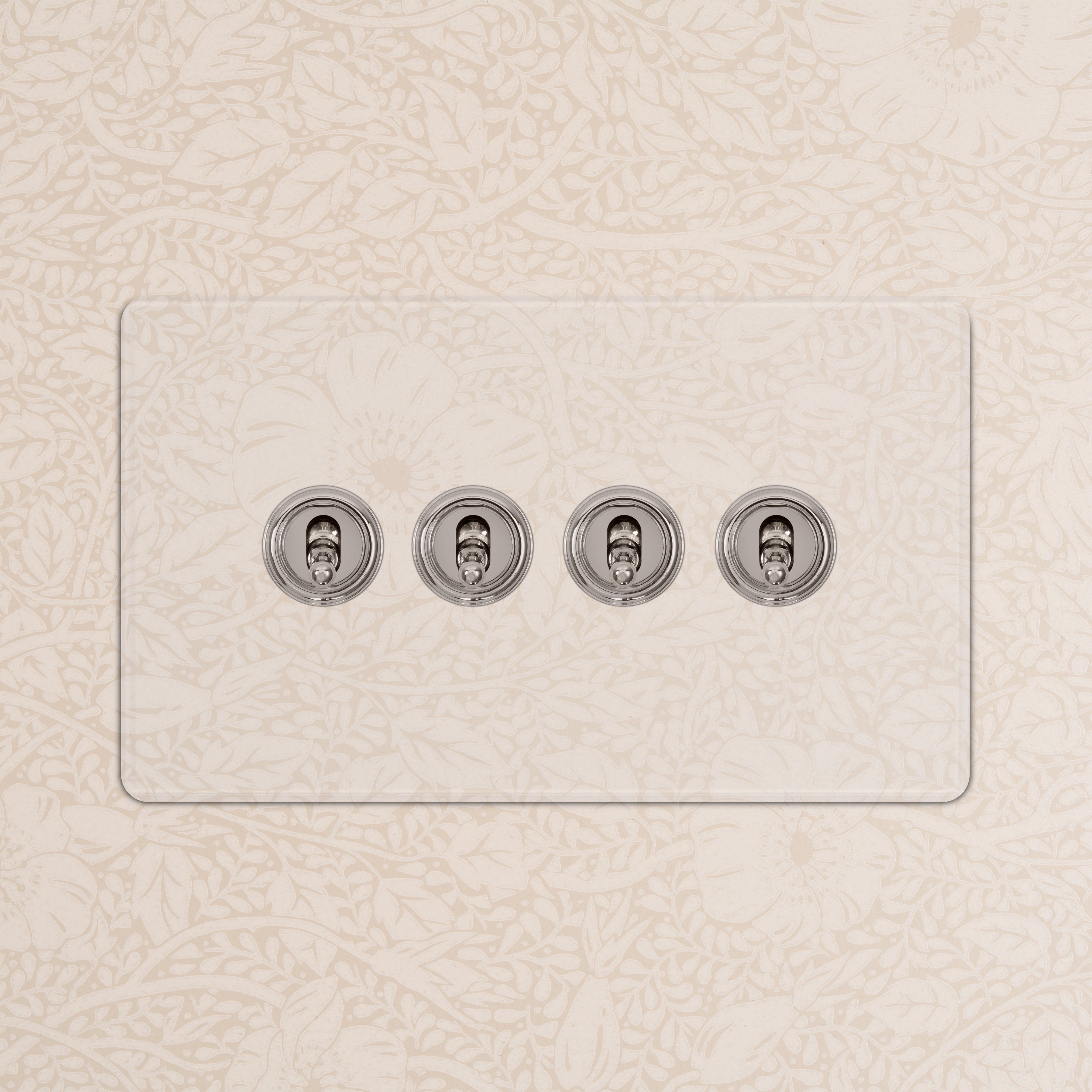 Our 4 gang two-way toggle switch is a modern take on the classic dolly design. We’ve crafted it to be as sleek and timeless as possible in any interior setting.