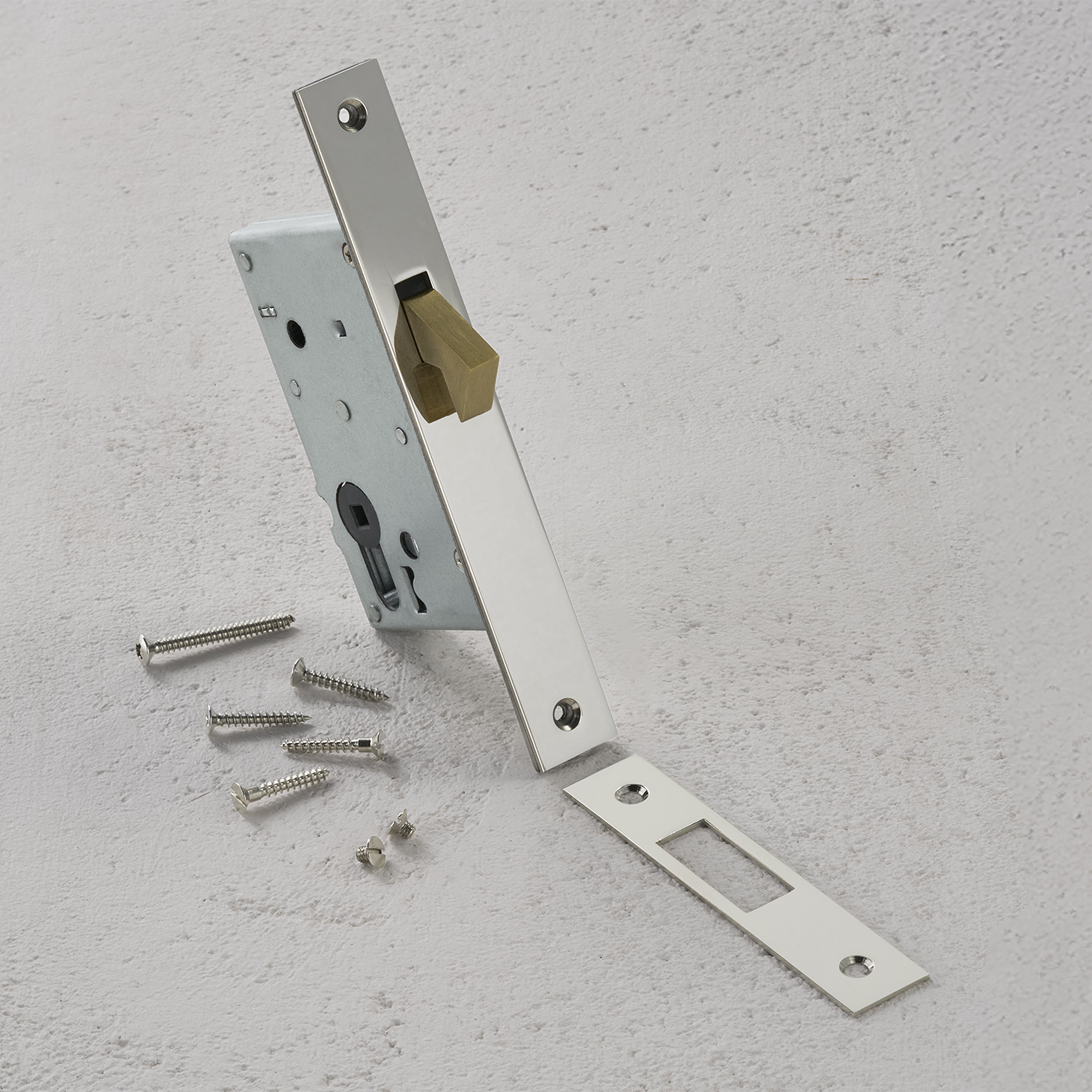 It comes with a solid brass face plate and strike plate, along with refined mounting screws, for a look that’s clean and considered.