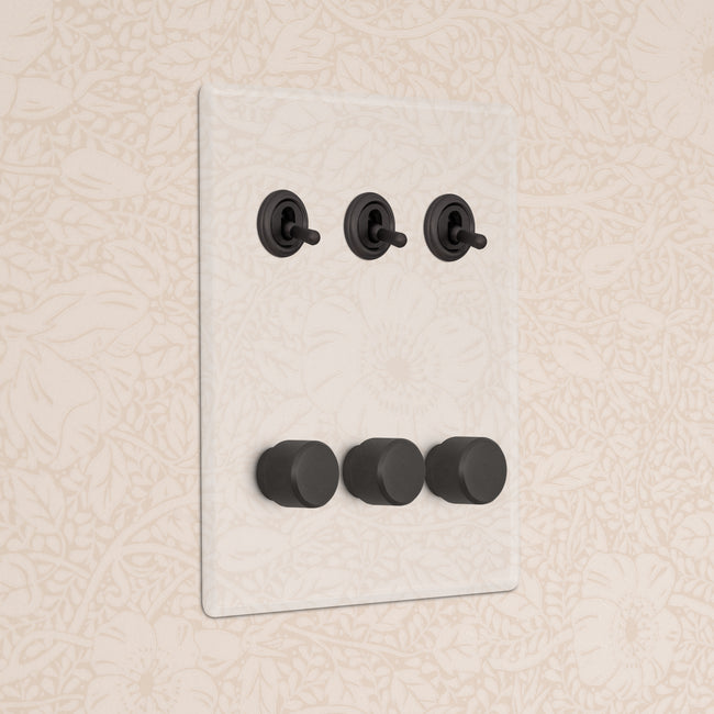This 6 gang mixed switch combines three two-way toggles and three rotary dimmers on one plate.