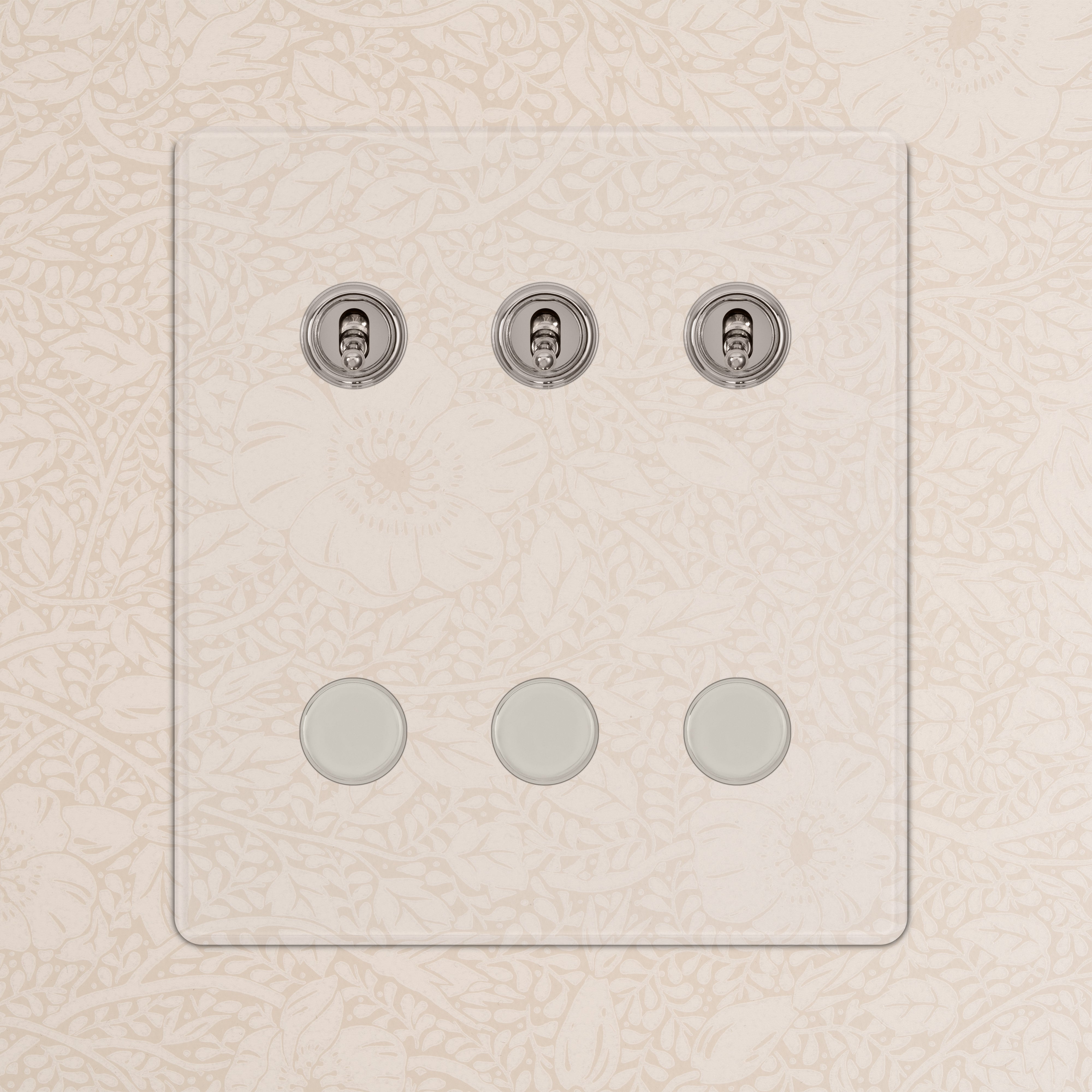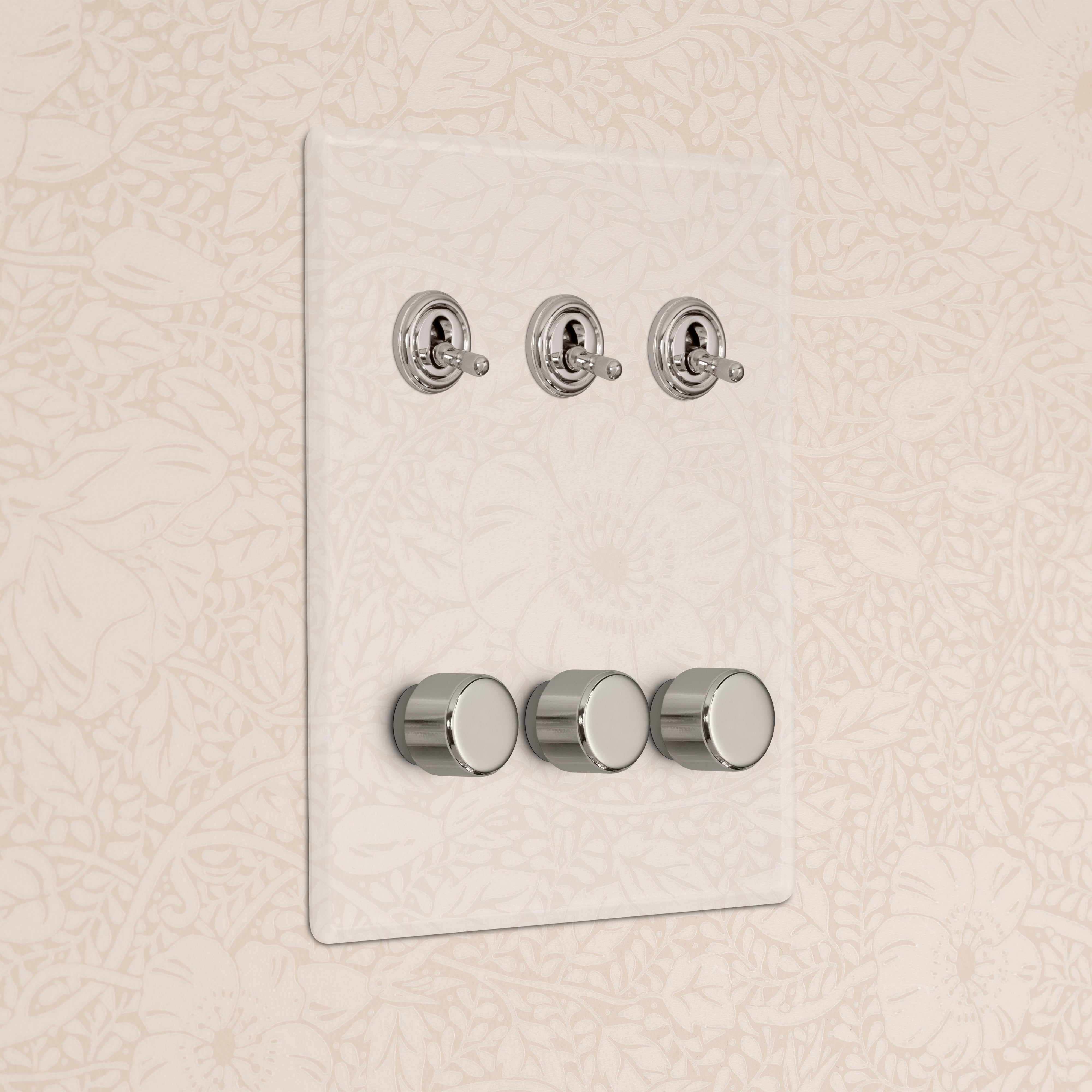 This 6 gang mixed switch combines three two-way toggles and three rotary dimmers on one plate.