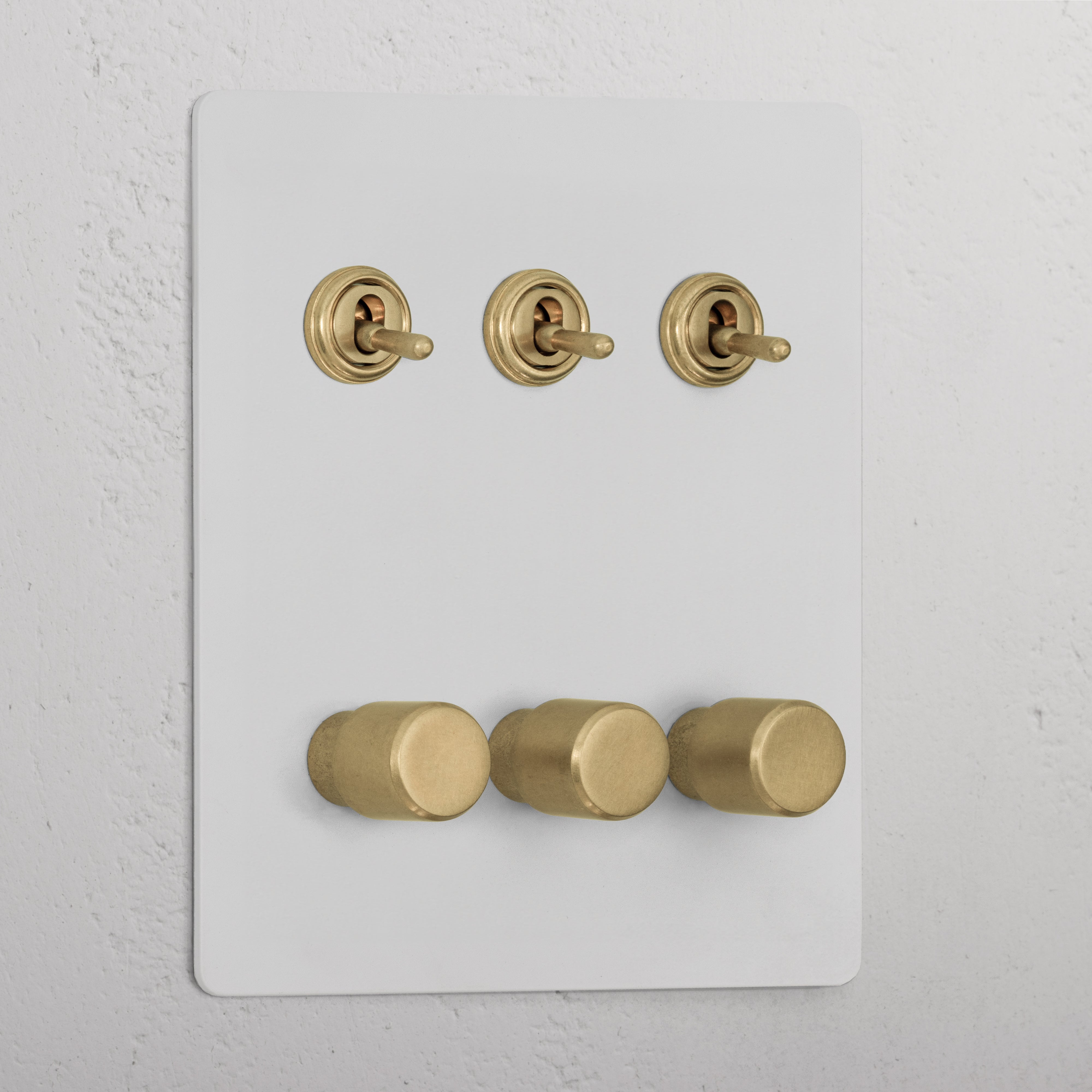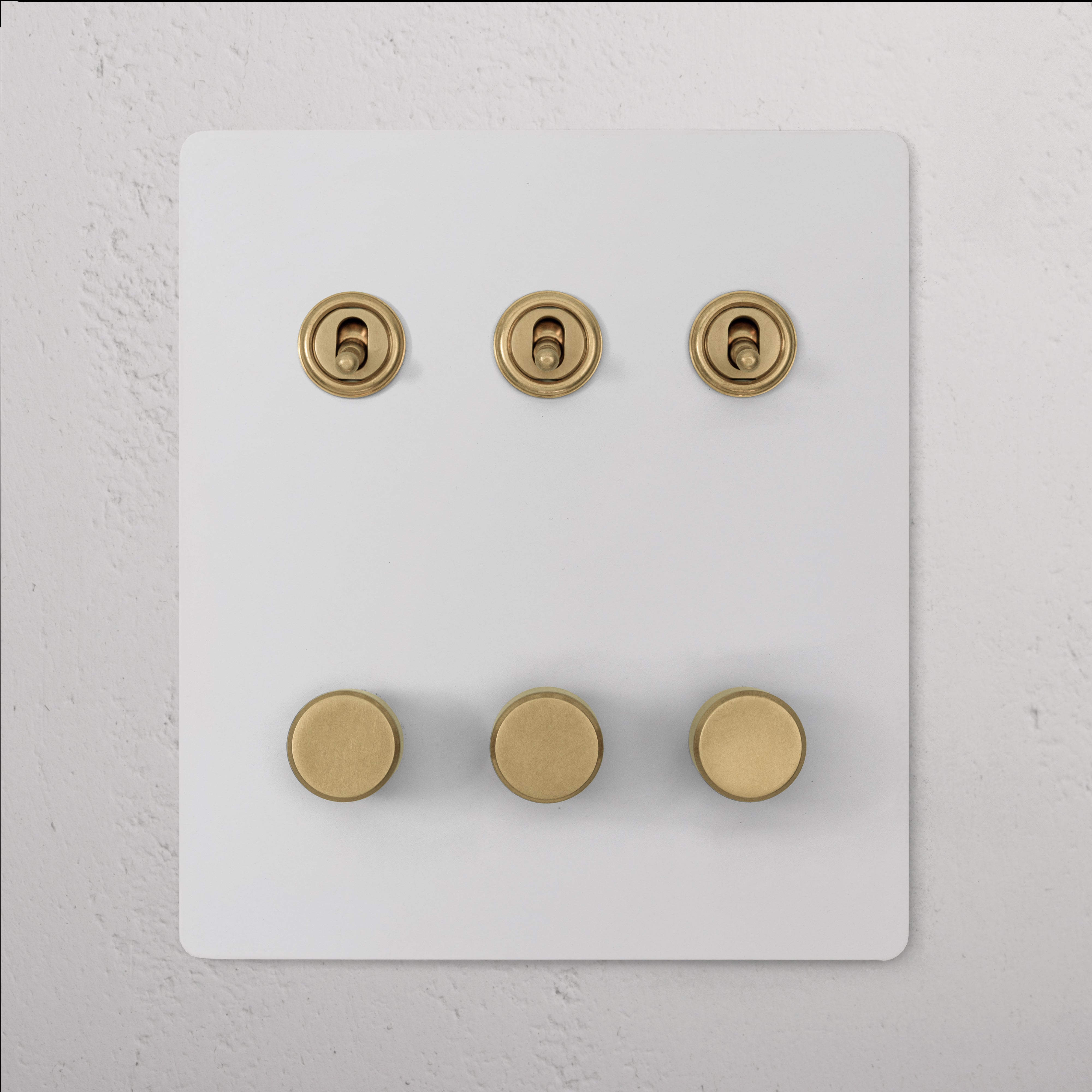 This 6 gang mixed switch combines three two-way toggles and three rotary dimmers on one plate.