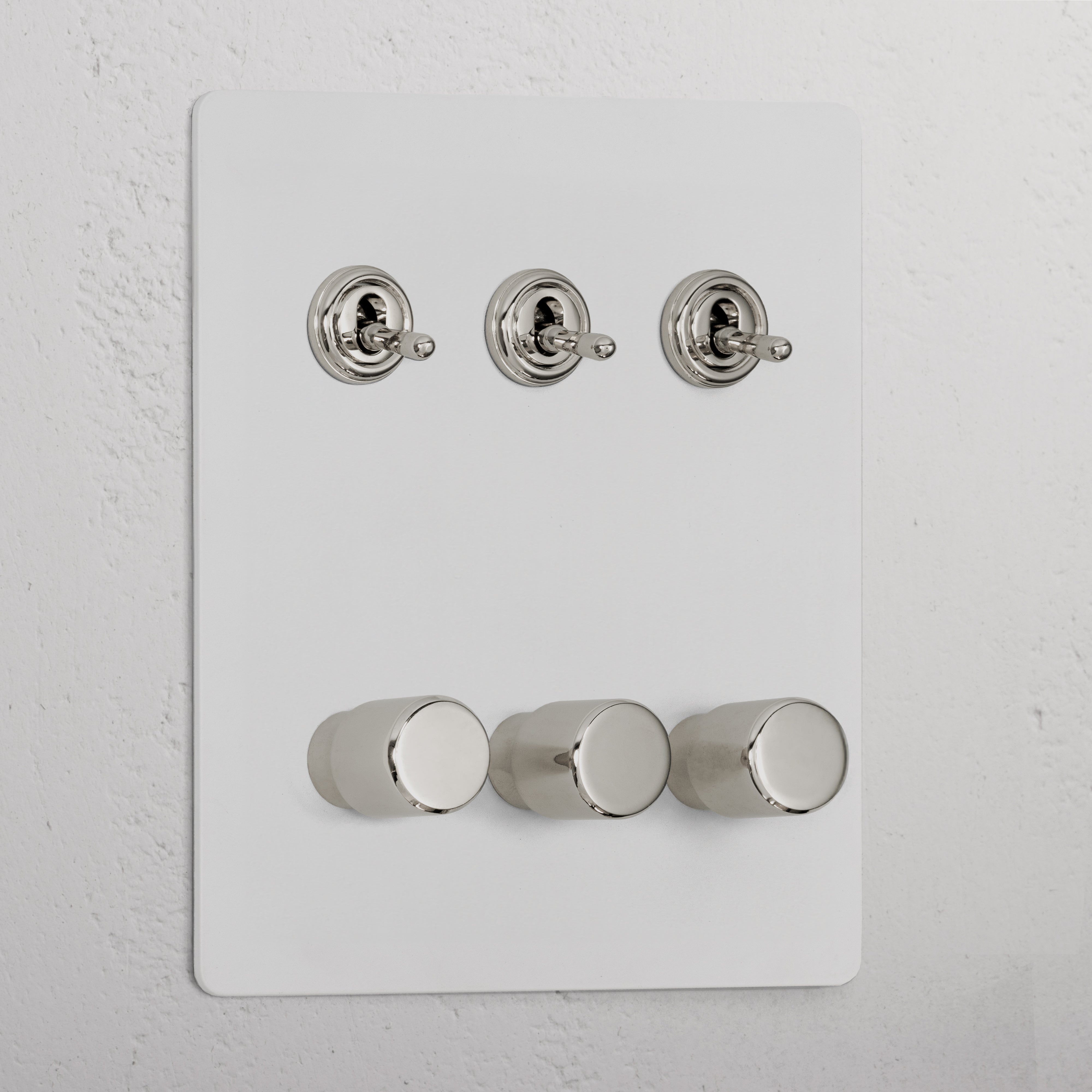 This 6 gang mixed switch combines three two-way toggles and three rotary dimmers on one plate.