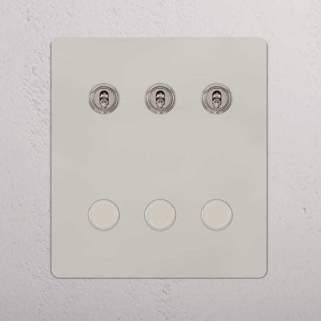 This 6 gang mixed switch combines three two-way toggles and three rotary dimmers on one plate.