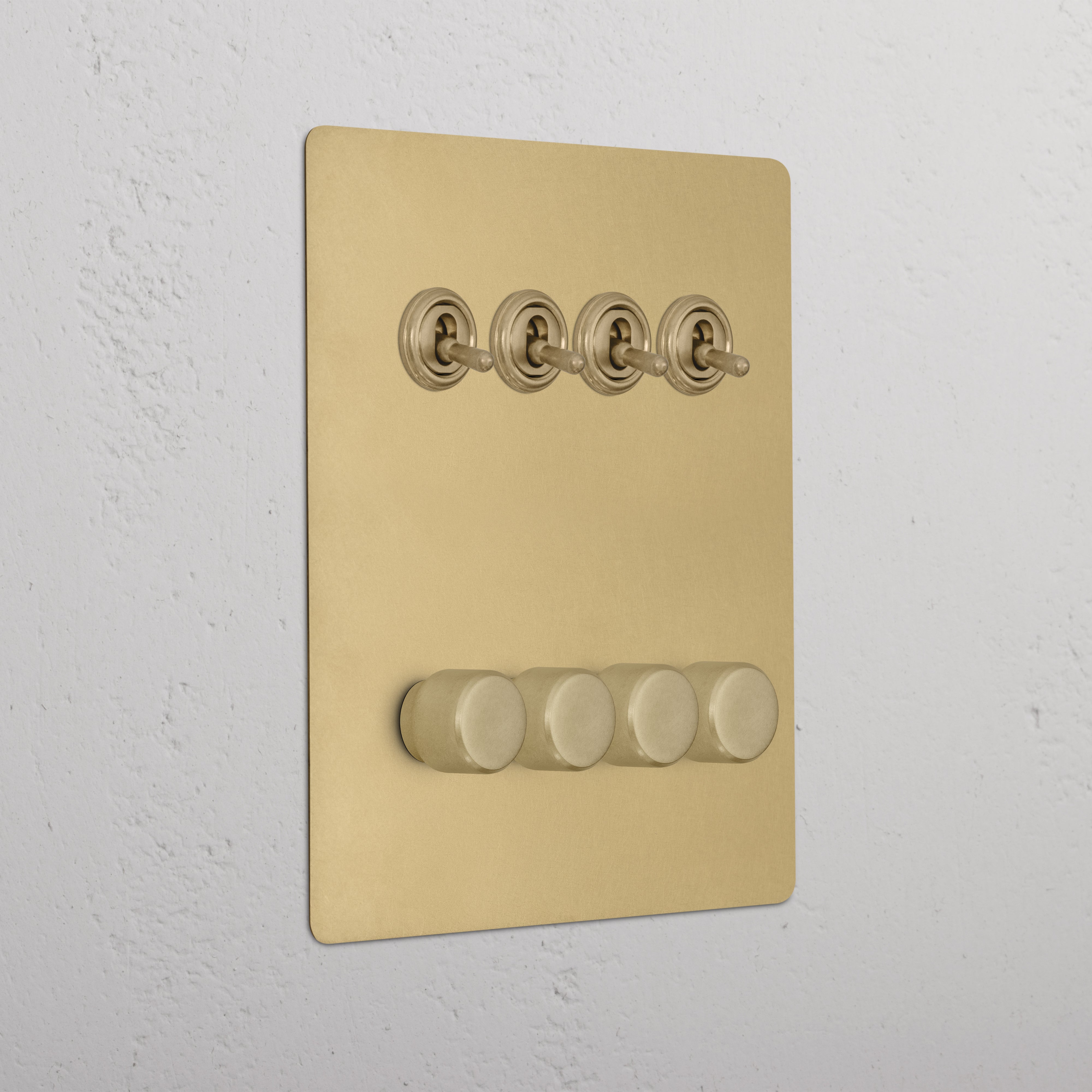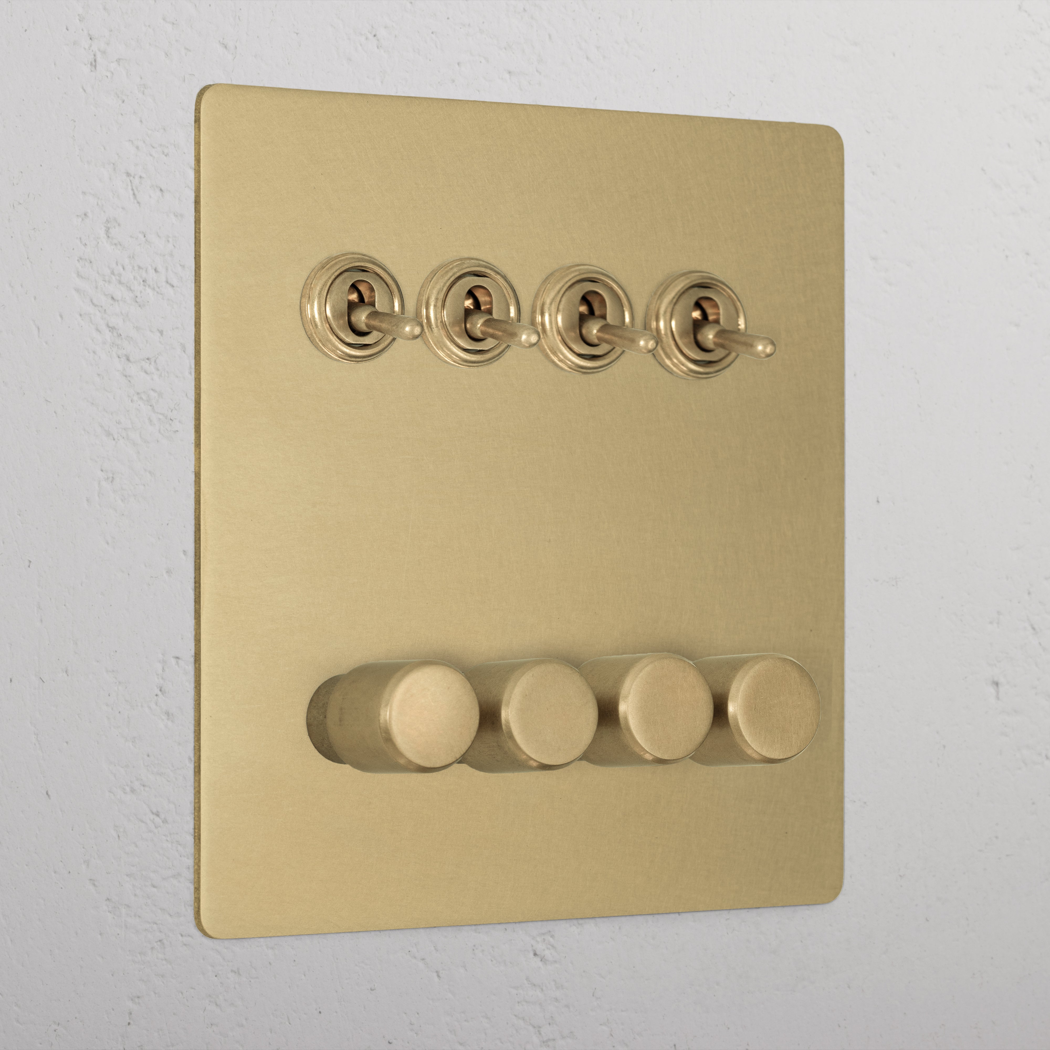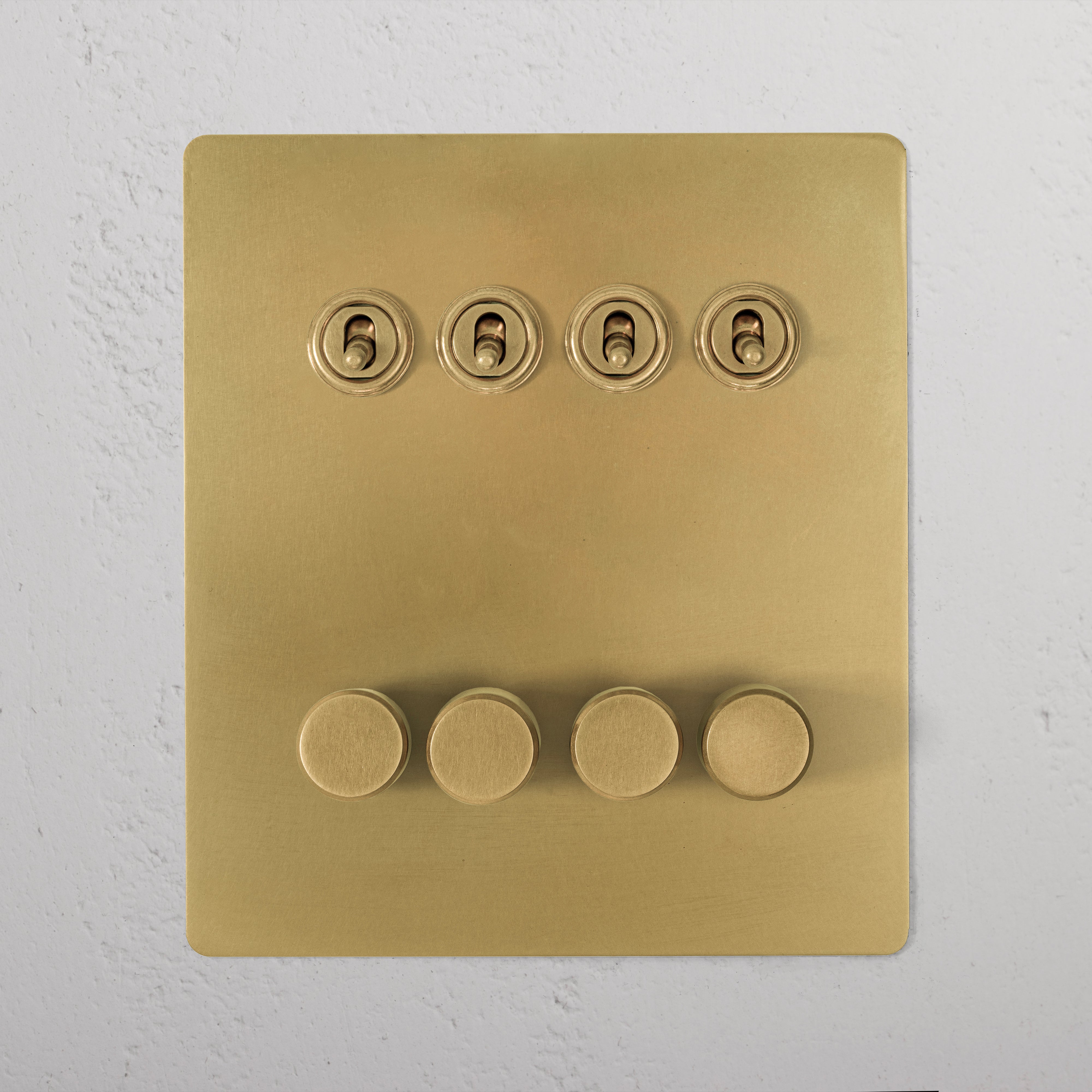 This 8 gang mixed switch combines four two-way toggles and four rotary dimmers on one plate.