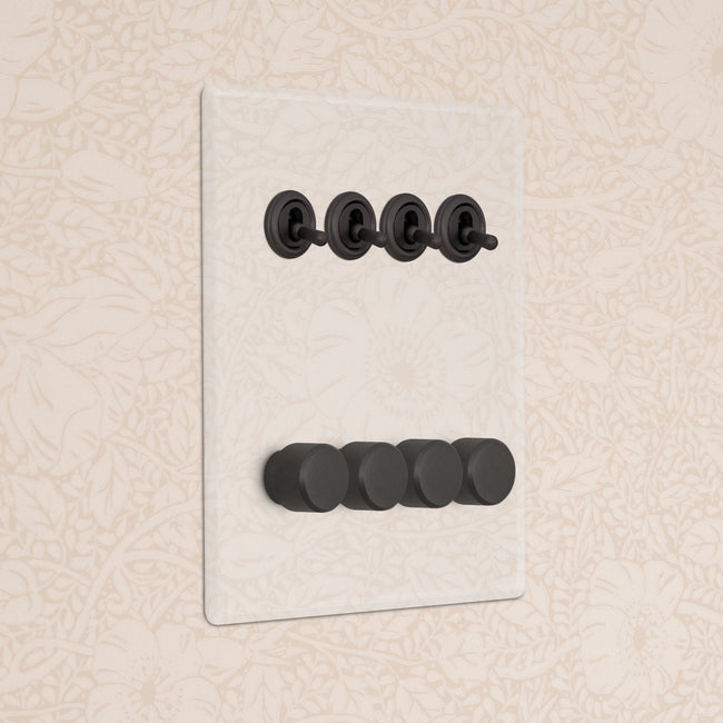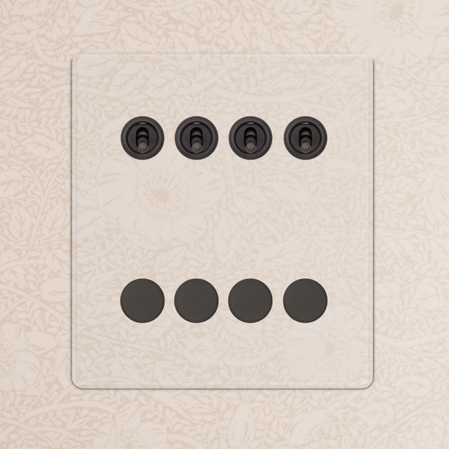 This 8 gang mixed switch combines four two-way toggles and four rotary dimmers on one plate.
