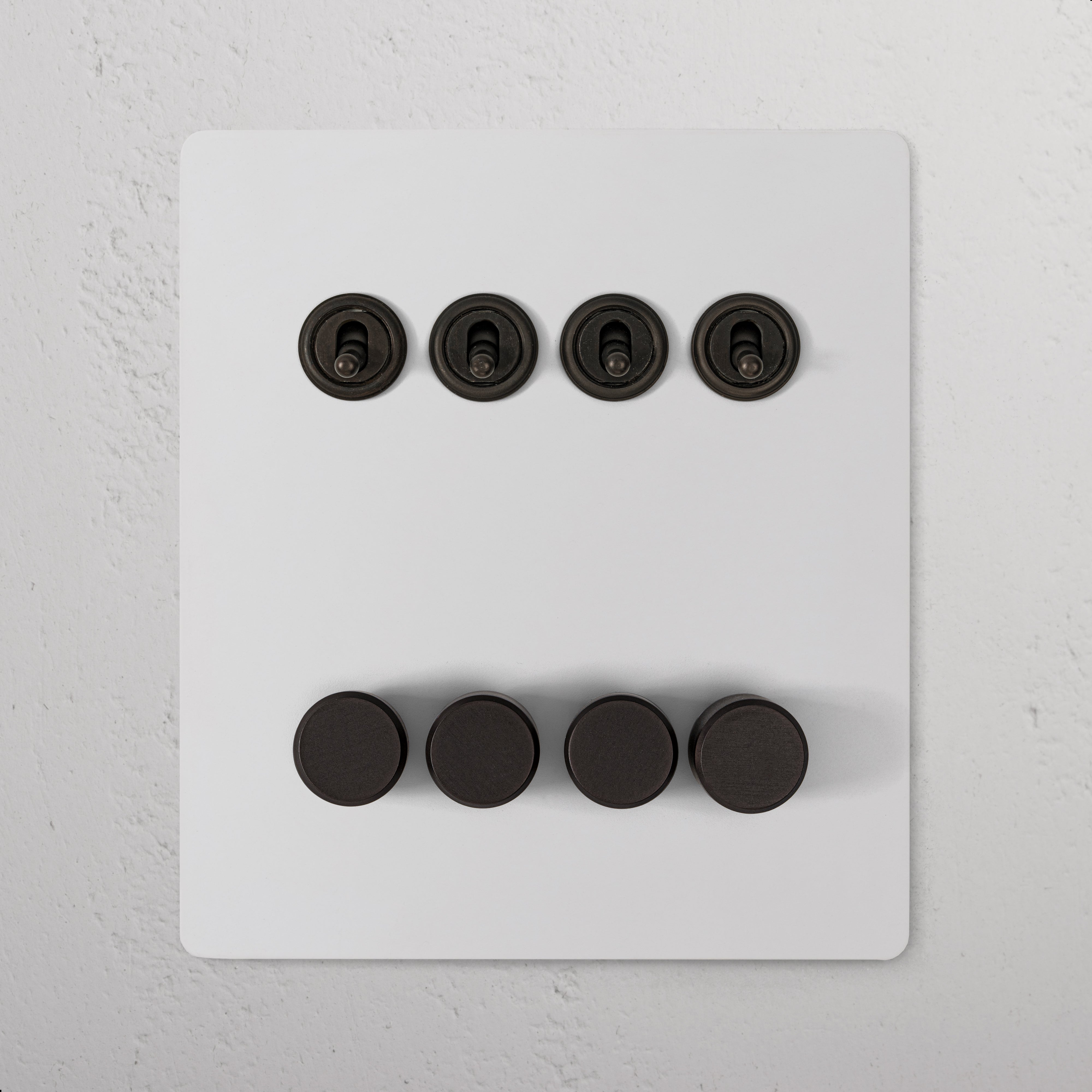 This 8 gang mixed switch combines four two-way toggles and four rotary dimmers on one plate.