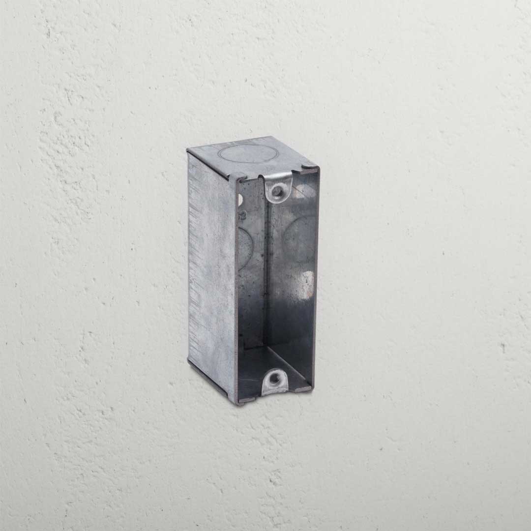 This single architrave back box is made from galvanised metal. It’s for solid walls or where studs are exposed and it’s deep enough to hold all the electrics inside.