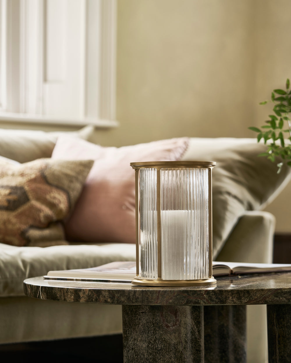 We’ve built a solid marble maxi tealight holder into the base of the lantern to create the illusion of a large pillar candle without the worry of it burning down.