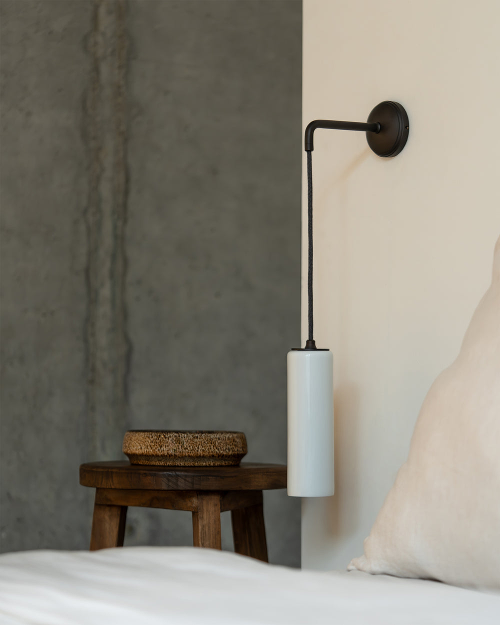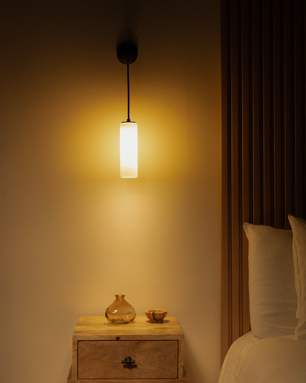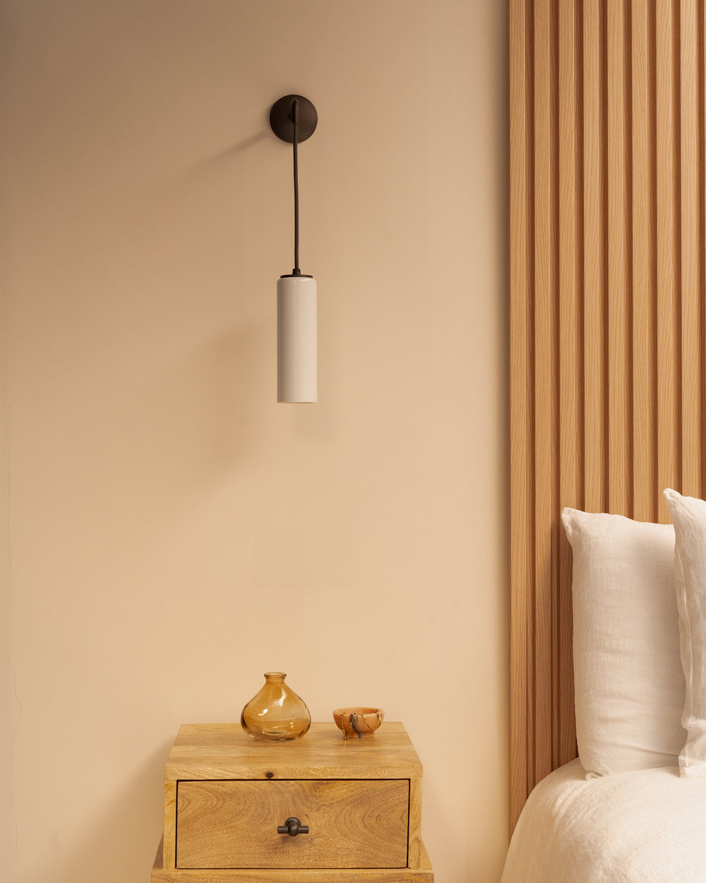This hanging version of our Claremont small fixed wall light is a modern take on a classic design. It’ll look great on its own, or on either side of your bed.