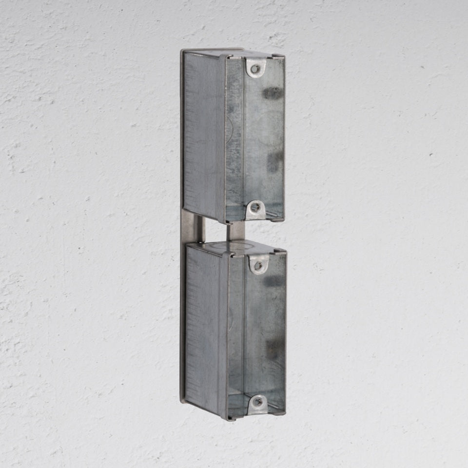 This double architrave back box is made from galvanised metal. It’s for solid walls or where studs are exposed and it’s deep enough to hold all the electrics inside.