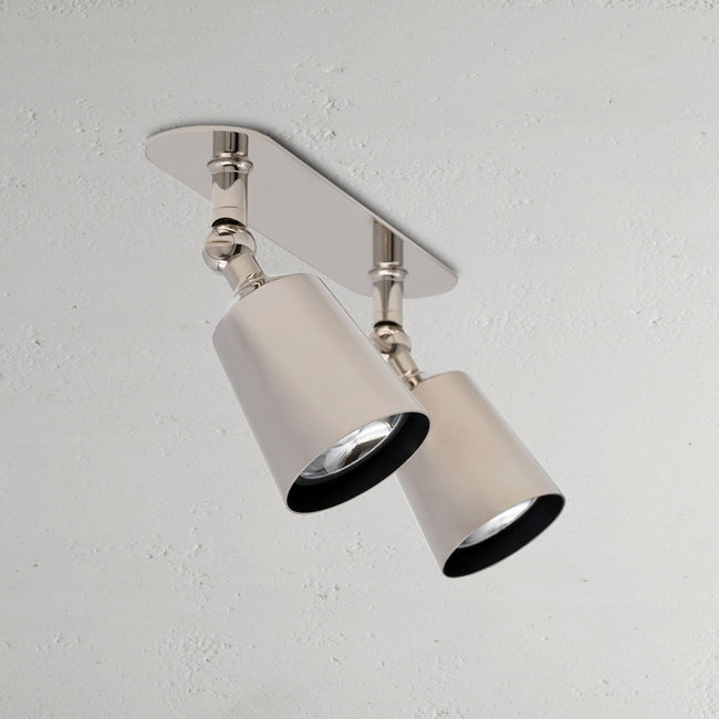 The electric connections in the Perryn double ceiling spotlight are tucked away, while a spring mechanism secures the mounting plate to plasterboard.