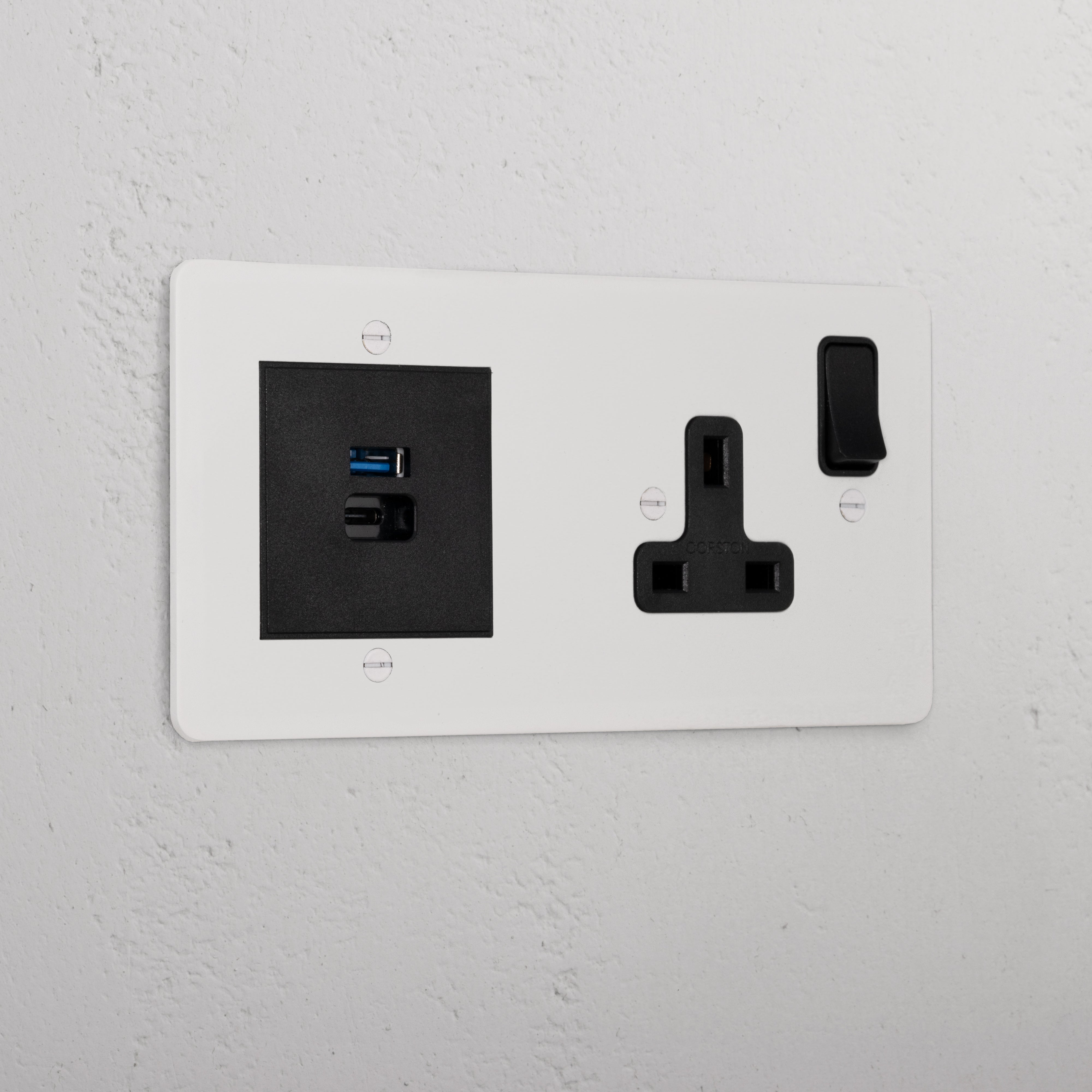 The switch and inserts around the sockets are made from a low-sheen black plastic or white with a slightly textured finish.