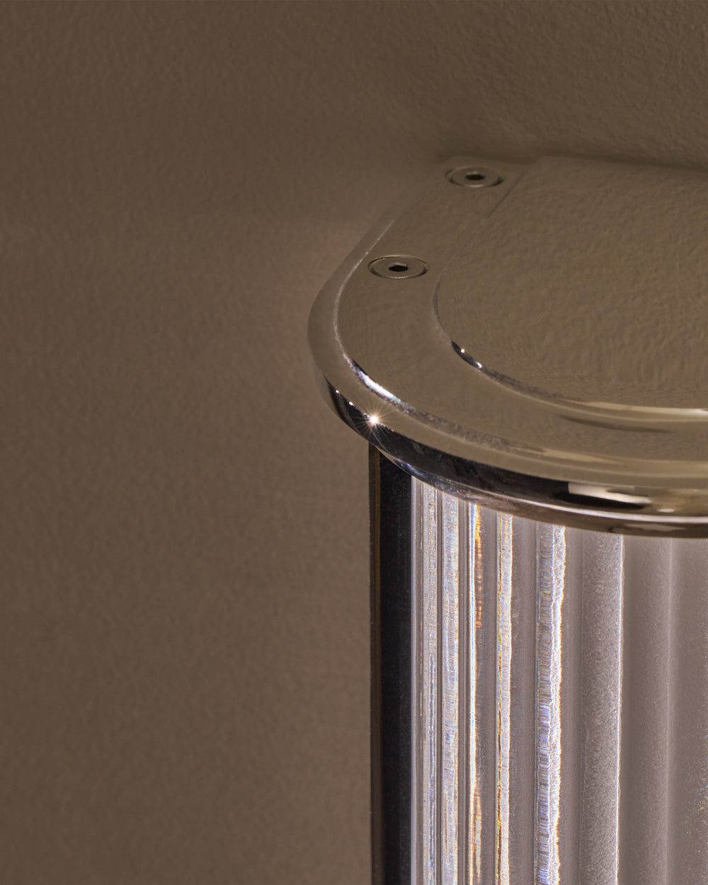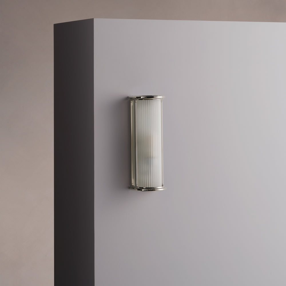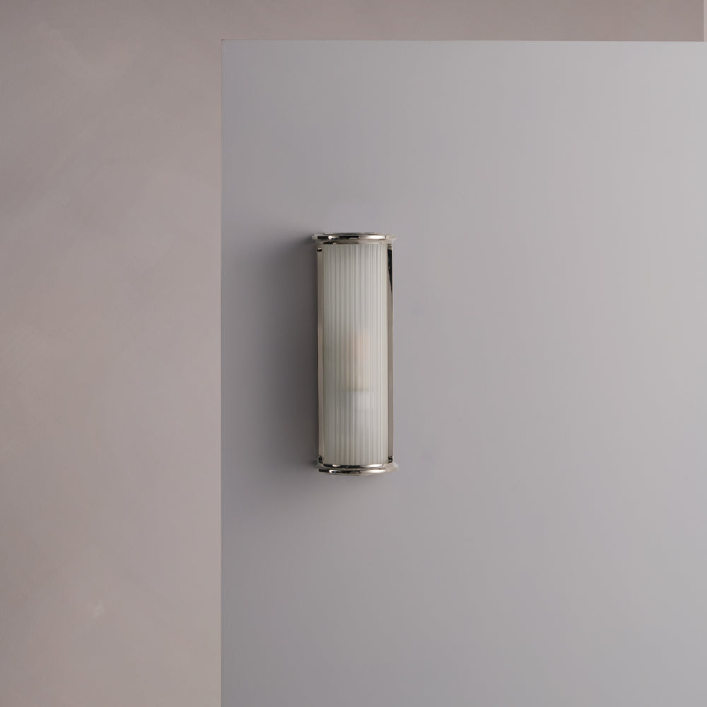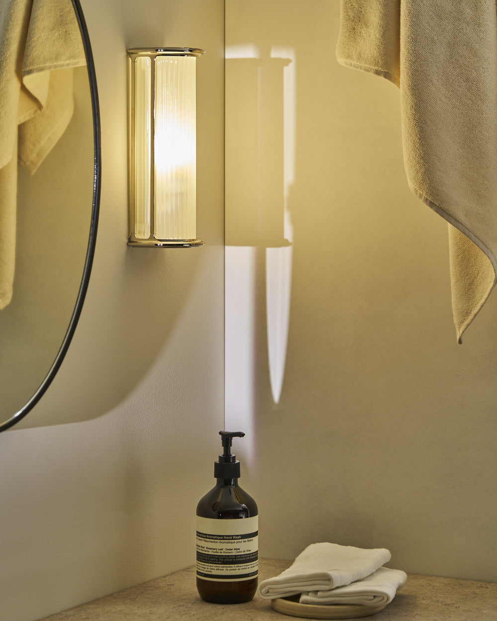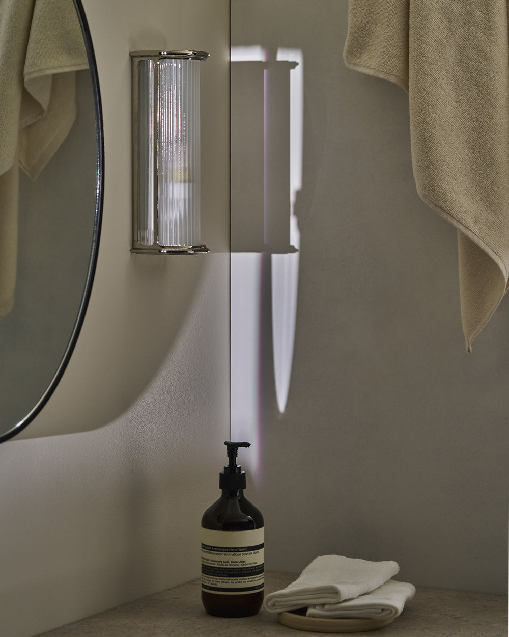 Bank is our take on a box light featuring a sturdy solid brass frame that holds a frosted fluted glass shade. The internal parts have been powder coated in white, so it looks great whether it’s switched on or off.