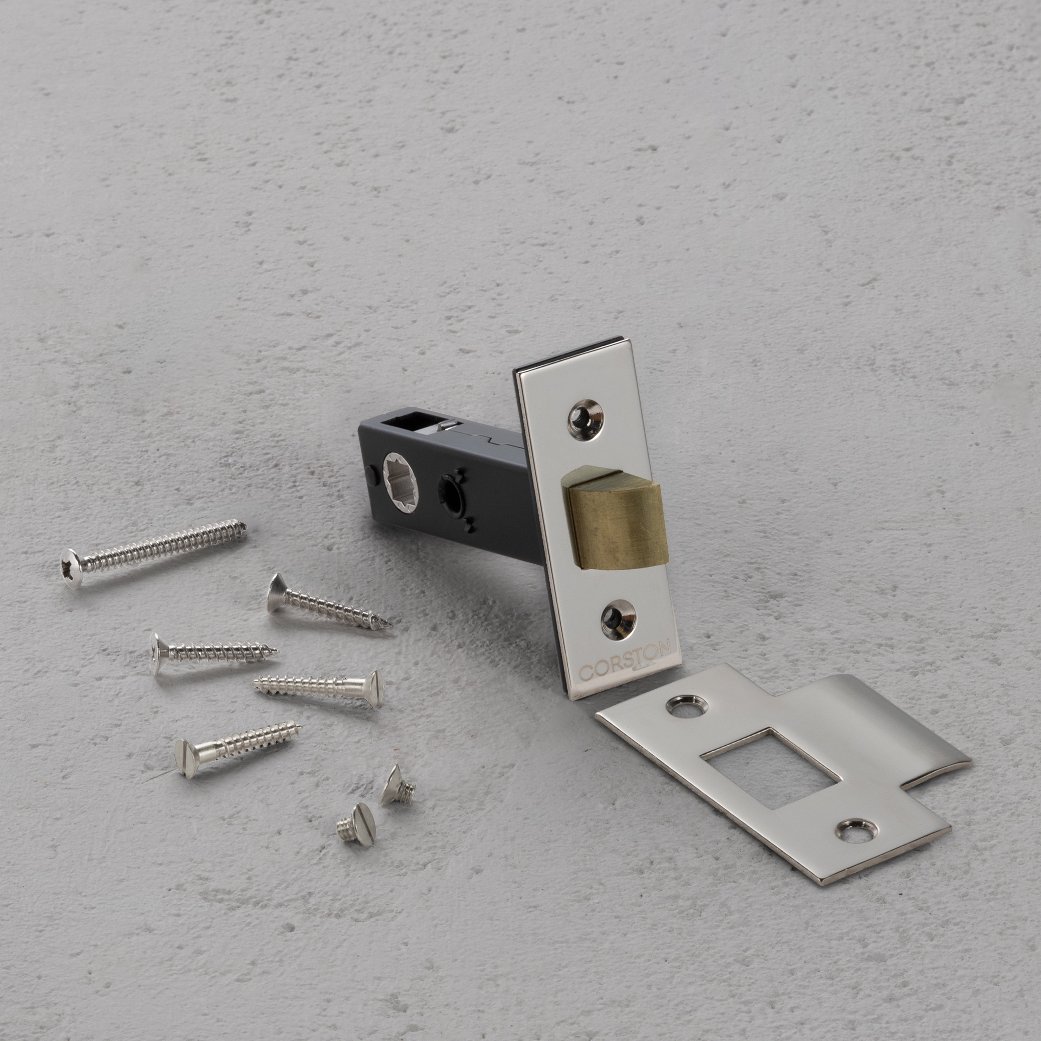 - Polished nickel-finished face plate and strike plate made from solid brass